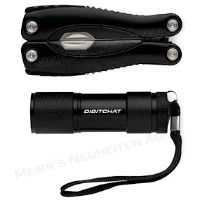 Lampenset 9-teiliges Edelstahl Multitool mit 13 Funktionen und Aluminiumgriff in Metalloptik plus einer Aluminium Taschenlampe mit 9 weissen LED-Birnen. Inklusive abnehmbarer Schlaufe bei der Lampe.