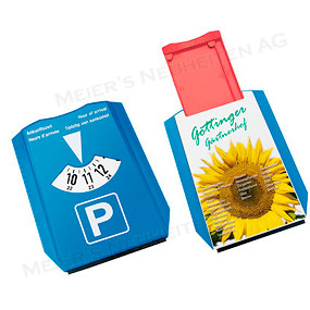 Bemerkungen: Parkscheibe aus stabilem Kunststoff mit Eiskratzer, Gummilippe und auf der Rückseite eine Notfach für verschiedene Utensilien wie Kleingeld, Scheckkarte, Einkaufswagenchips.