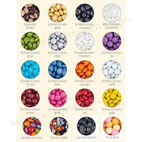 Bemerkungen: Das Reagenzglas aus Kunststoff kann mit folgenden sortenreinen Füllungen bestellt werden: Zuckerfreie Mintpastillen, Mini Espresso Schokolinsen (braun + beige gemischt) Traubenzuckerpastillen, Fruitballs, Salmiak-Splitter oder Mini-Schokolinsen bunt gemischt oder sortenrein. Die Schokolinsen gibt es in den Farben: blau, braun, gelb, grün, lila, orange, pink, rot, schwarz, türkis oder weiß. Es können auch 2-3 Wunschfarben (gemischt) in einem Reagenzglas bestellt werden. Mini-Schokolinsen in gold oder silber sowie vegane Mini Schokolinsen, bunt gemischt oder Schoko-Goldsterne (weiter Füllungen auf Anfrage).