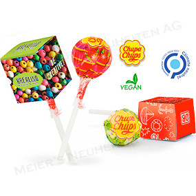 Der 12g Kugel-Lolly von Chupa Chups in den gemischten Geschmacksrichtungen Apfel, Orange, Erdbeere und Kirsche wird in der Box aus weissem Glanzkarton zum rundum sympathischen Werbeträger.