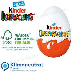 Bemerkungen: 1 Original Kinder-Überraschungs-Ei von Ferrero im Karton verpackt, der Karton kann mit einem 1-4 farbigen Digitaldruck bedruckt werden! Nachhaltigkeit: Klimaneutrales Produkt. FSC®-zertifizierter Karton aus nachhaltiger Forstwirtschaft. Für Ferrero hat bei der Kakaobohnenbeschaffung nicht nur beste Qualität oberste Priorität, sondern auch die Unterstützung der Kakaobauern in den Erzeugerländern!