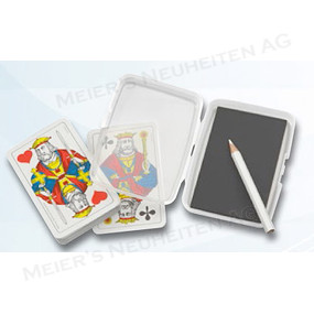 Die Box ist mit einer Kreidetafel, Kreidestift, und 36 Stk. deutschen oder französischen Jasskarten mit neutraler Rückseite bestückt. Selbstverständlich kann die Box mit Werbespielkarten mit Ihrem Logo bestückt werden. Wir können Ihnen sämtliche Jass-, Spiel-, Puzzle-, Quartett- oder andere Karten liefern. Fragen Sie uns an. |