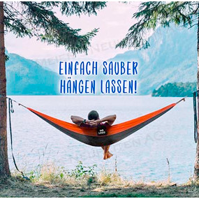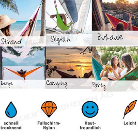Die Hängematte aus recyceltem Fallschirm-Nylon mit einer Tragkraft bis zu 250 Kg. ist platzsparend und langlebig. Ideal für zu Hause auf dem Balkon, Reisen, Segeln, Camping im Park am See usw. Alles was Sie brauchen sind lediglich zwei feststehende Elemente um die Hängematte mittels mitgelieferter Karabinerhaken dazwischen platzieren zu können. Pro Seite ist die Hängematte mit je 1m Nylonseil ausgestattet. Zum Transport kann die Hängematte platzsparend im Stoffbeutel verstaut werden. |